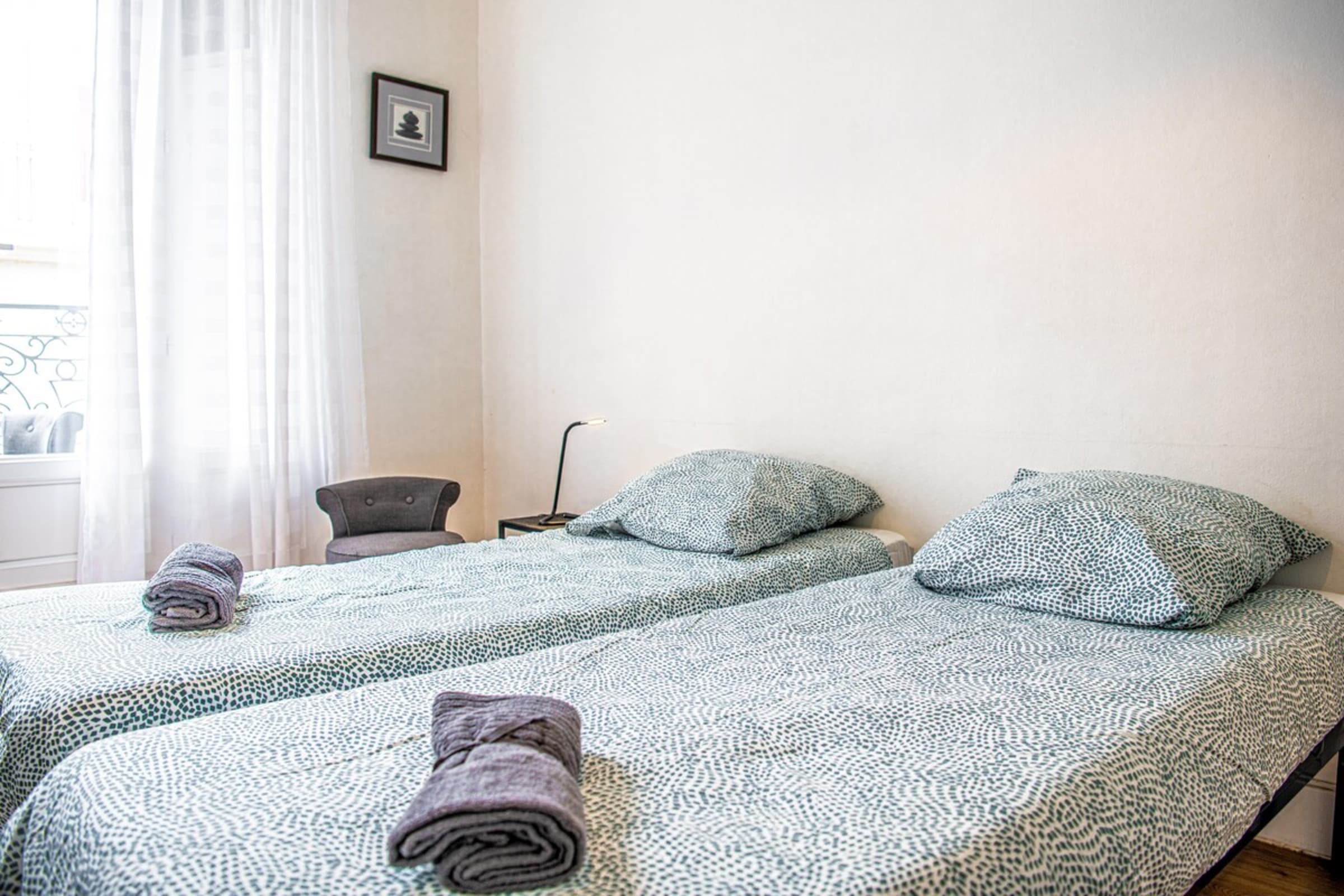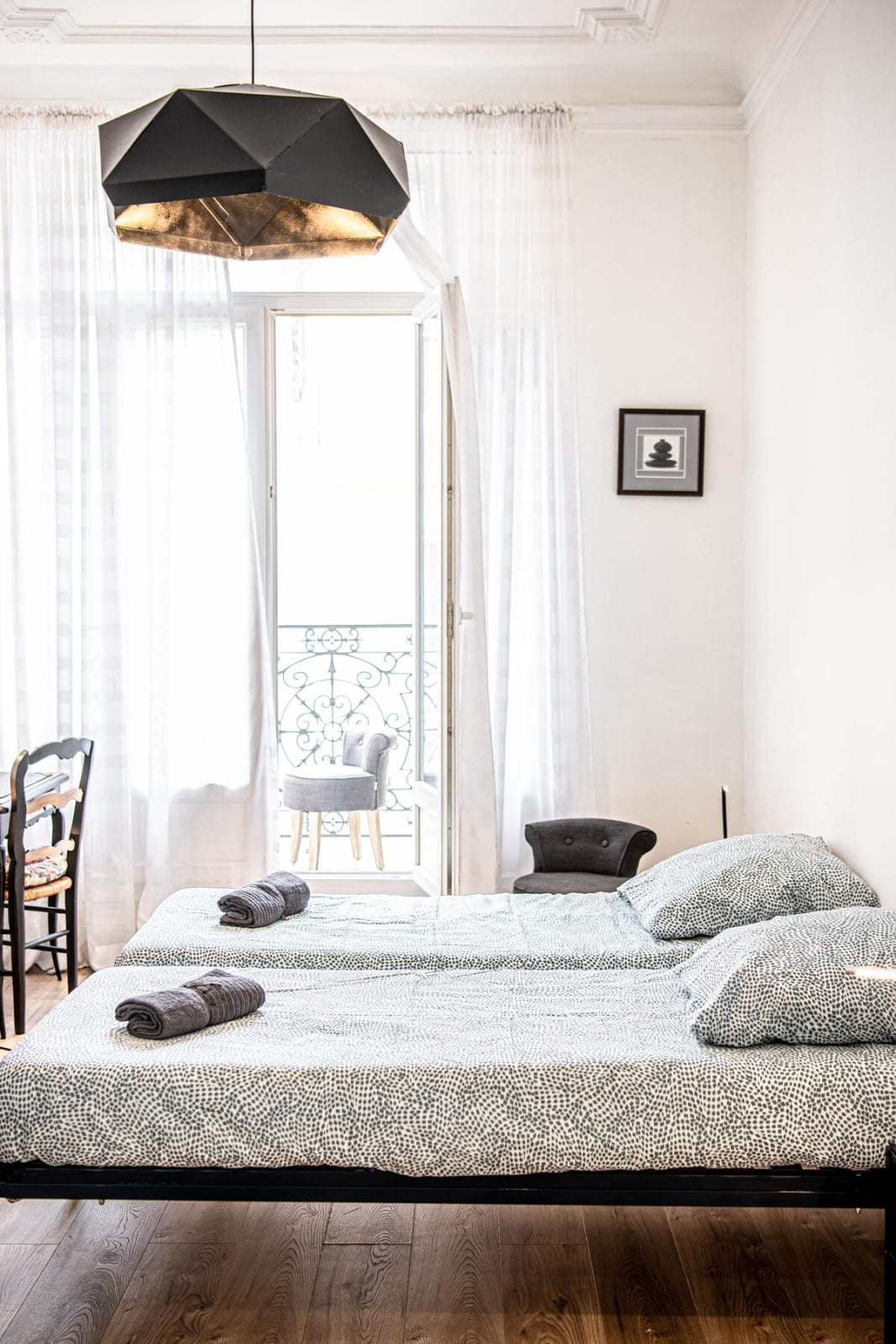 L'espace nuit propose une première chambre avec un grand lit deux places et un dressing pour ranger vos affaires durant votre séjour et la seconde chambre propose deux lits une place.