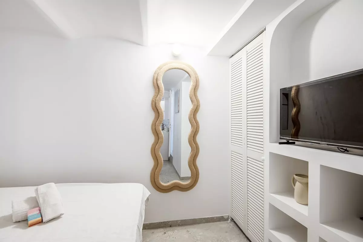 The studio includes a comfortable sleeping area with a 160x200 double bed, perfect for a romantic getaway or a relaxing stay.